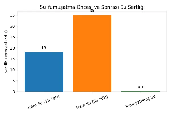 Su sertliği yüksek bölgelerde ham suyun °dH değeri 18 ile 35 arasında değişebilir. Yumuşatma işleminden sonra çıkış suyu sertliğinin 0,1 °dH seviyesine düştüğü görülür. Aşağıdaki grafikte iki farklı ham su sertliğinin işlem öncesi ve sonrası durumu gösterilmektedir. Grafik, sertliğin ne kadar dramatik biçimde azaldığını görsel olarak ortaya koyar ve yumuşatma sistemlerinin etkisini anlamaya yardımcı olur.